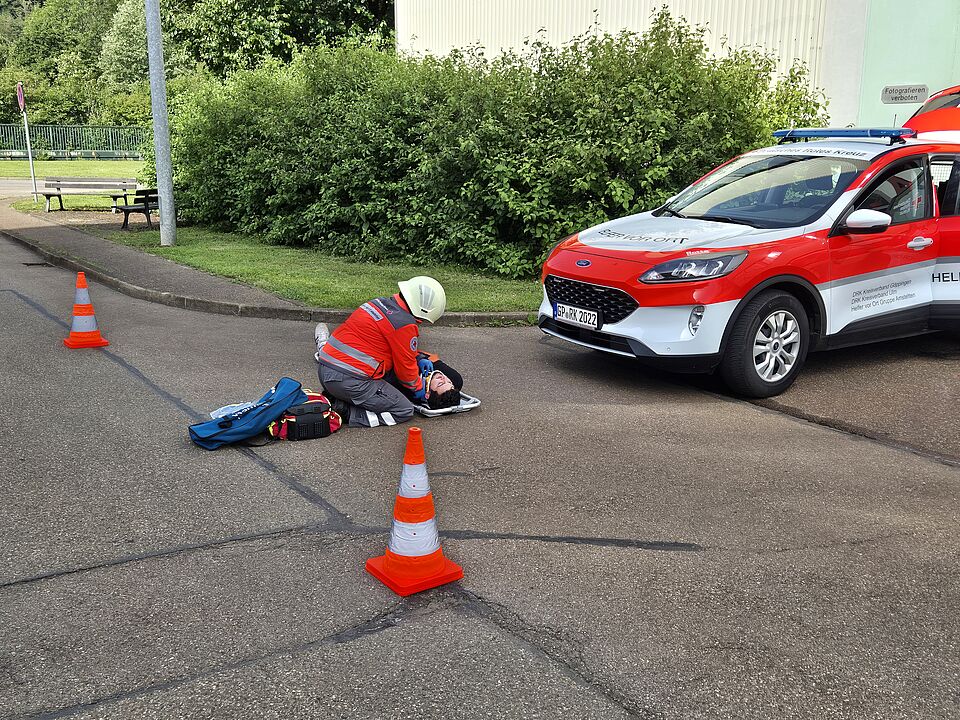Wir führen unsere erlernten Erste Hilfe Maßnahmen durch und betreuen den Patienten.